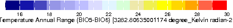 ∂X ∂Y Temperature Annual Range (BIO5-BIO6) from WORLDCLIM: Current conditions (interpolations of observed data, representative of 1950-2000). Resolution: 30 arc-seconds (~1 km).