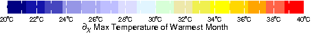 bio5 partial_X partial_X X Max Temperature of Warmest Month from WORLDCLIM: Current conditions (interpolations of observed data, representative of 1950-2000). Resolution: 30 arc-seconds (~1 km).