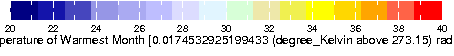 bio5 Max Temperature of Warmest Month from WORLDCLIM: Current conditions (interpolations of observed data, representative of 1950-2000). Resolution: 30 arc-seconds (~1 km).