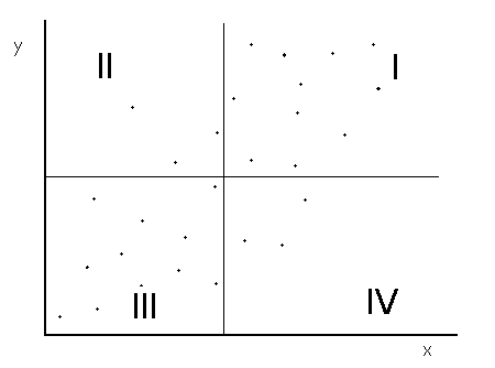 For points in quadrant I, both of the x and y values are larger than their respective means. These points will contribute positive terms to the correlation coefficient. In quadrant III, both the x and y values are less than their respective means, so in the formula for correlation coefficient, the product of the two terms in parenthesis is positive. These points also contribute positive terms to the correlation coefficient. Conversely, points in quadrants II and IV contribute negative terms to the correlation coefficient. Since most of the points fall in quadrants I and III, the correlation coefficient will be dominated by positive terms.