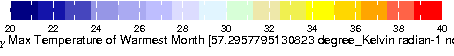 ∂X ∂Y Max Temperature of Warmest Month from WORLDCLIM: Current conditions (interpolations of observed data, representative of 1950-2000). Resolution: 30 arc-seconds (~1 km).