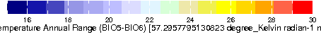 ∂Y Temperature Annual Range (BIO5-BIO6) from WORLDCLIM: Current conditions (interpolations of observed data, representative of 1950-2000). Resolution: 30 arc-seconds (~1 km).